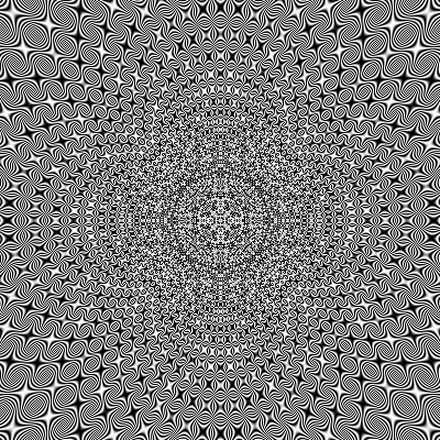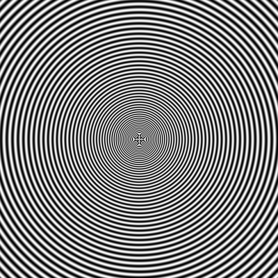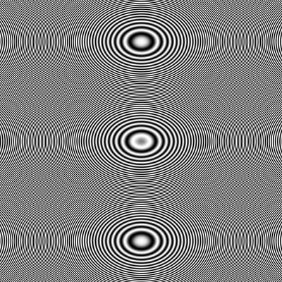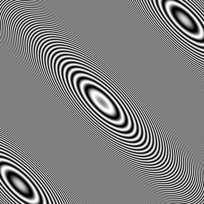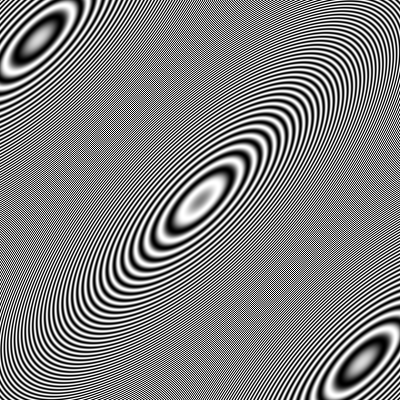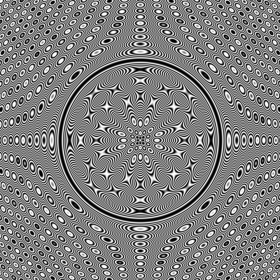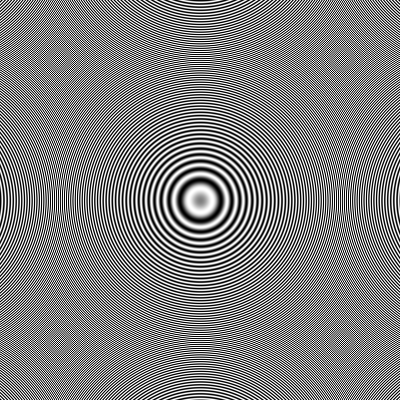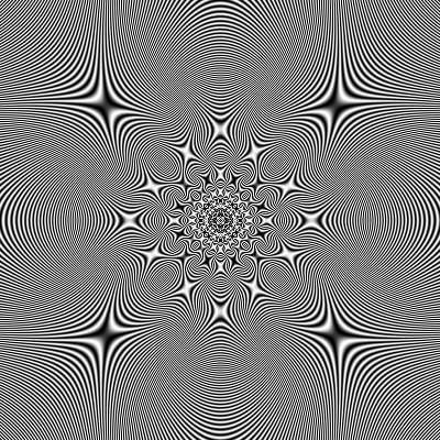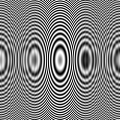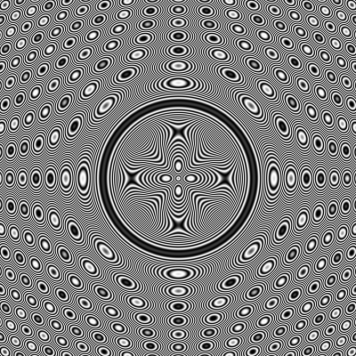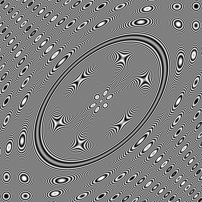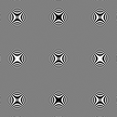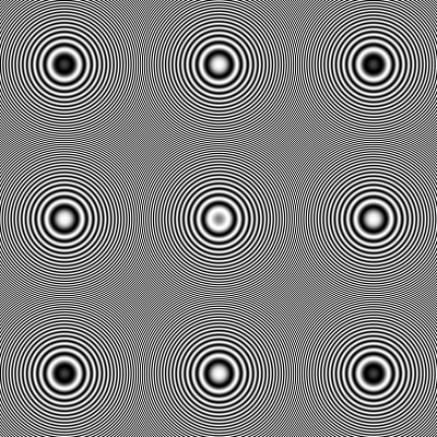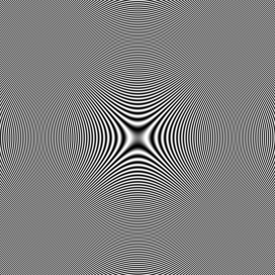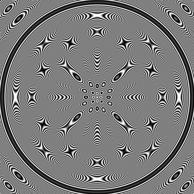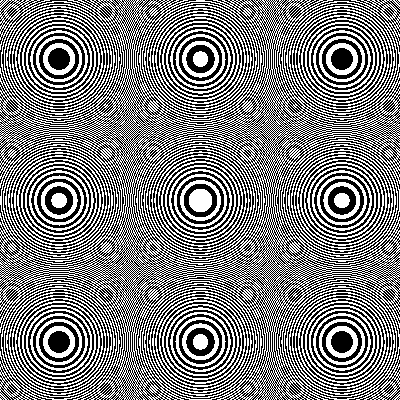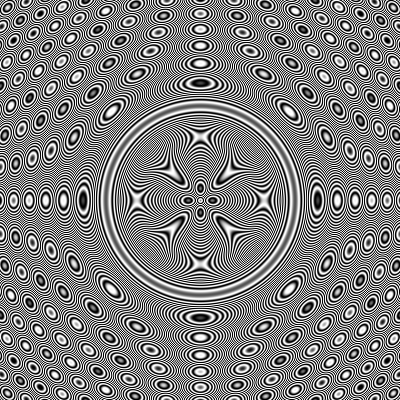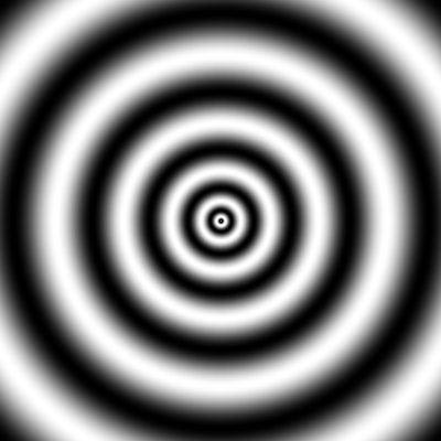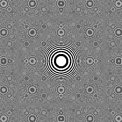 …using this surface. Despite differing in output (binary vs. continuous), both render structurally equivalent patterns: the sine version produces smooth grayscale textures, while the floor function yields crisp binary segmentation. In either case, the resulting 2D images exhibit radial, interference-like motifs - strongly reminiscent of diffraction or holographic patterns.